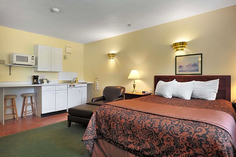 This suite features a tea/coffee maker, microwave, seating area and wet bar.
